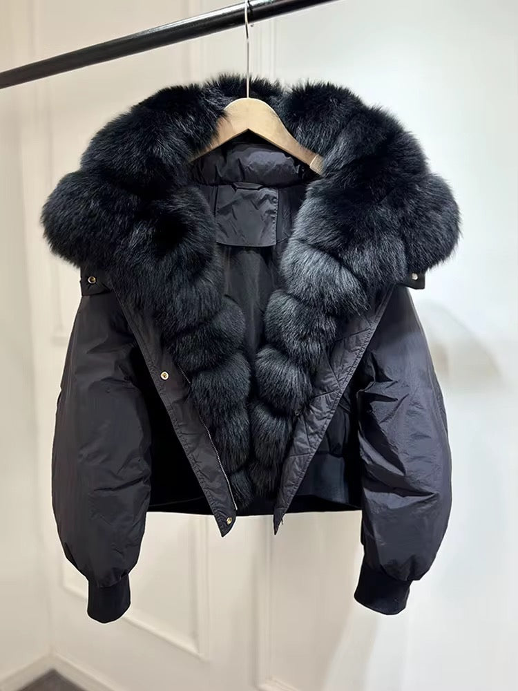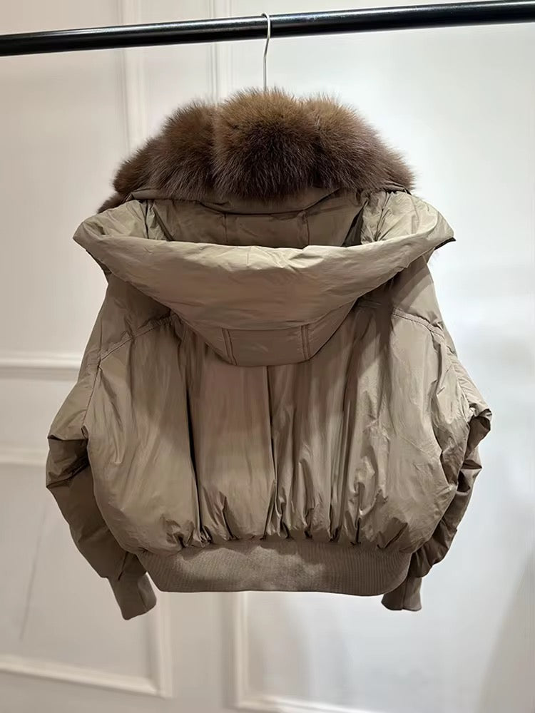 Real fox fur hooded coat filled with 90% white duck feathers. The fit is oversized - it has a draw string to tighten/loosen. This style has a hood.