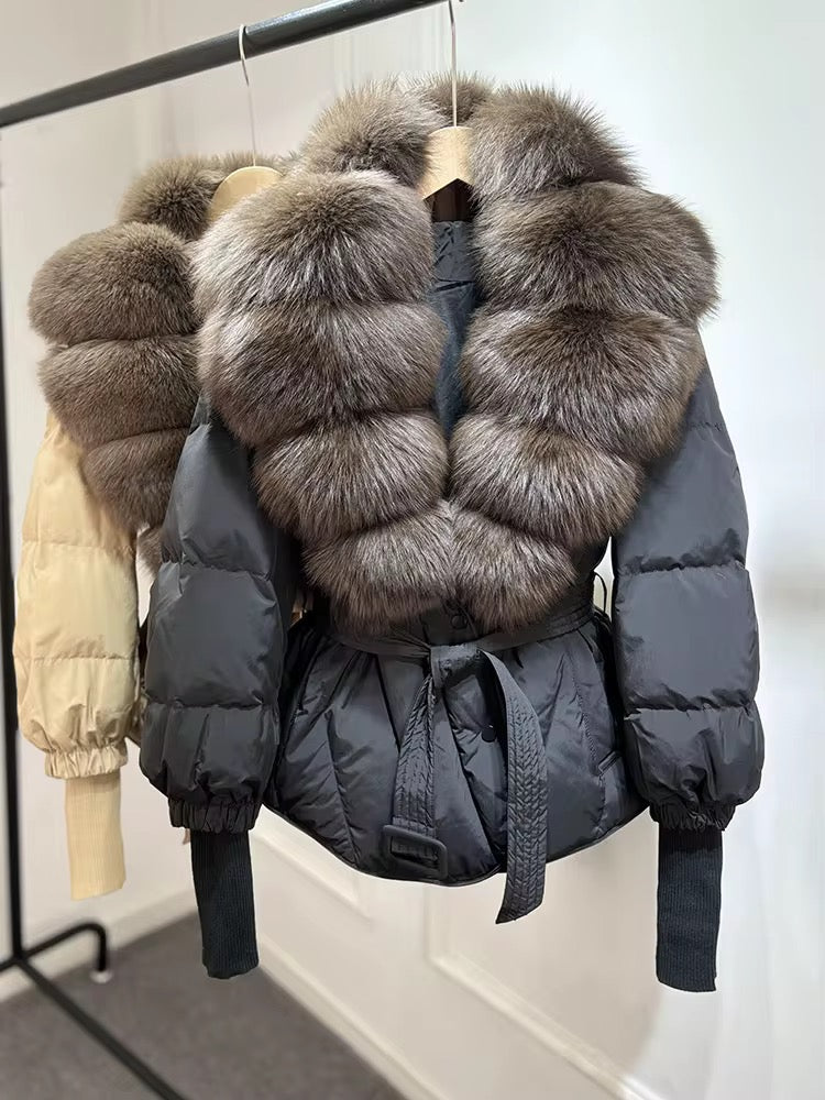 Real fox fur coat filled with 90% white duck feathers. The fit is oversized - it has a draw string to tighten/loosen. This coat has NO HOOD