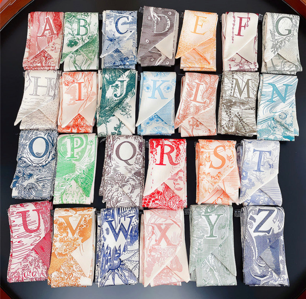 High quality printed twillys/neck scarves with initial letters.