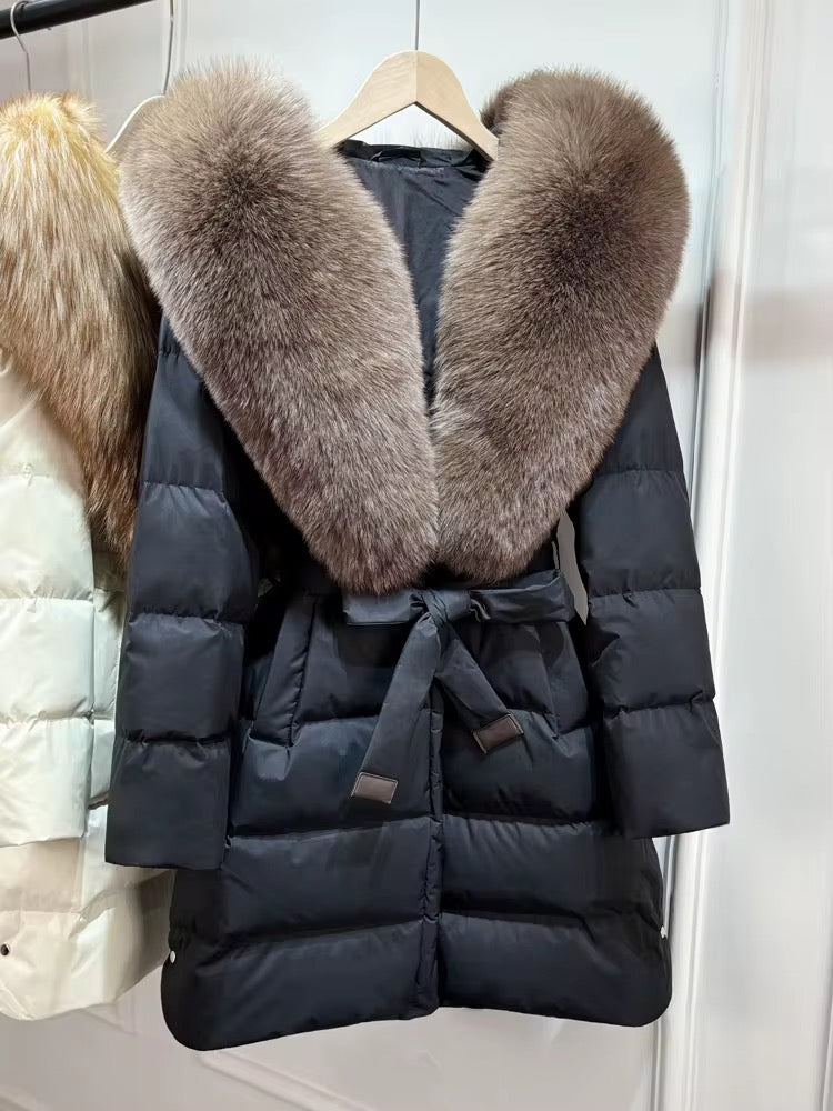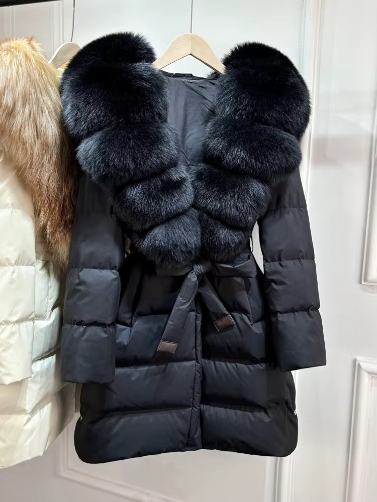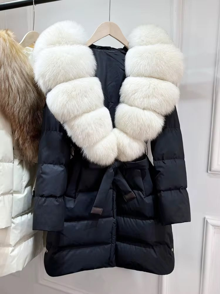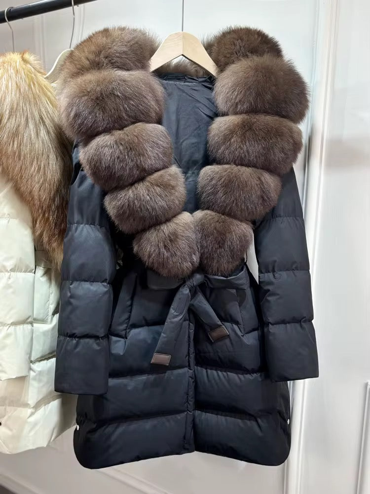 Real fox fur hooded coat filled with 90% white duck feathers. The fit is oversized - it has a draw string to tighten/loosen. This style has a hood.
