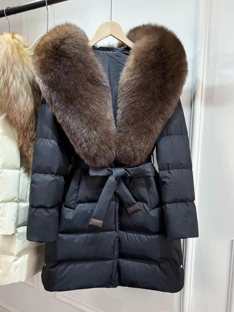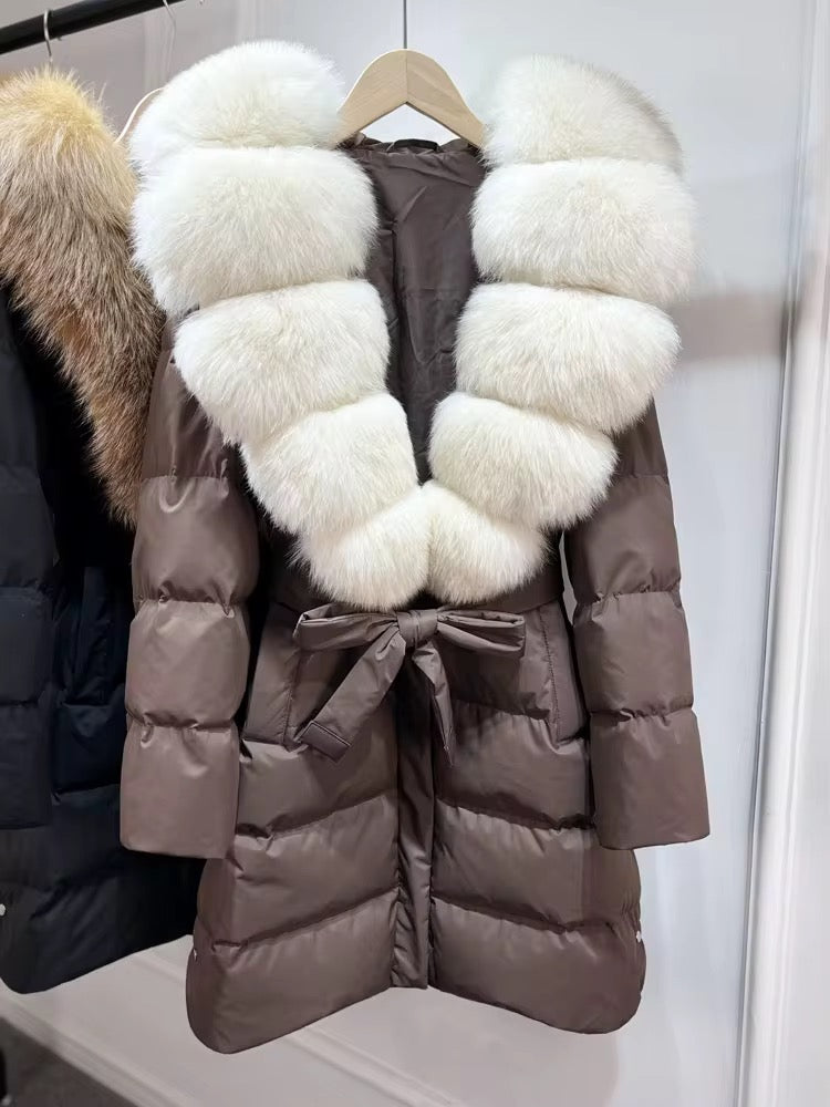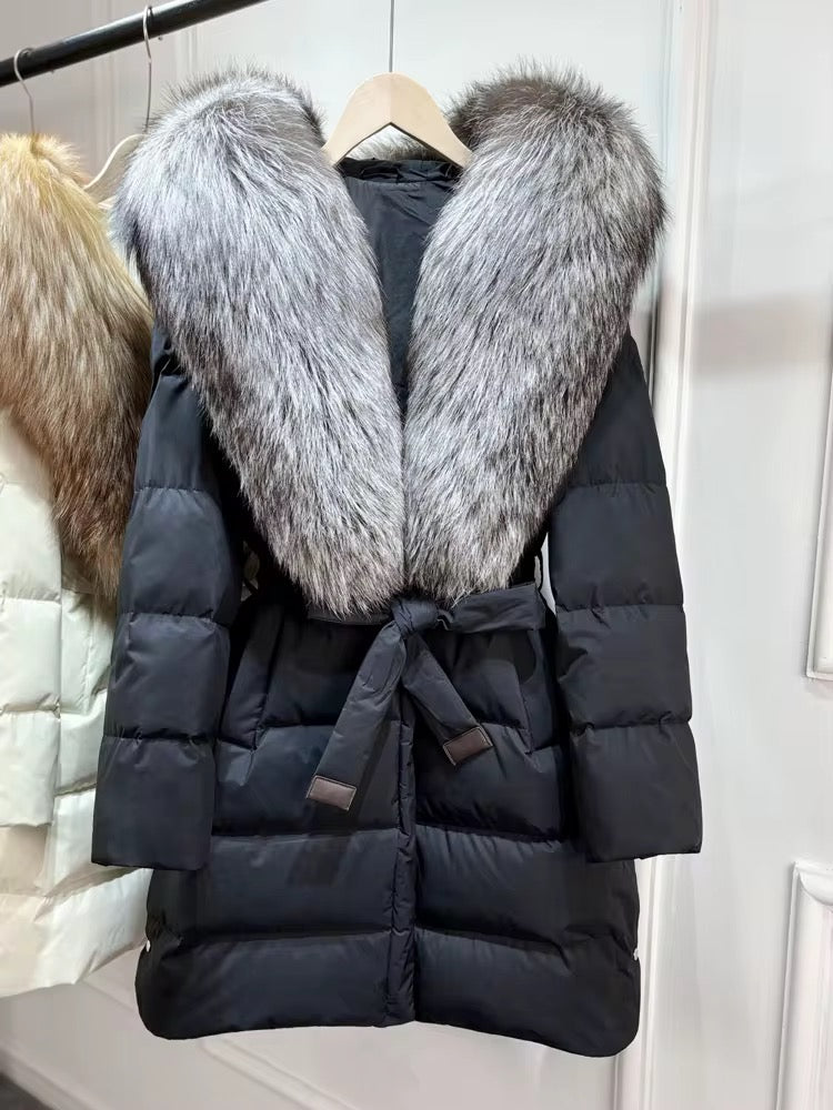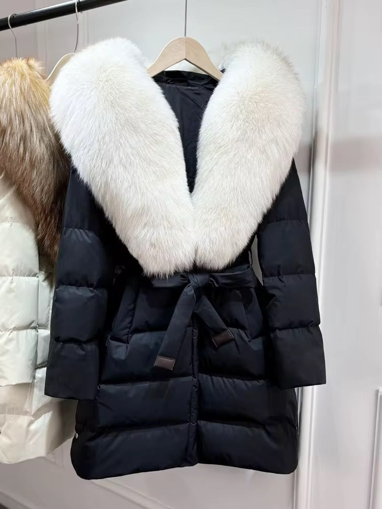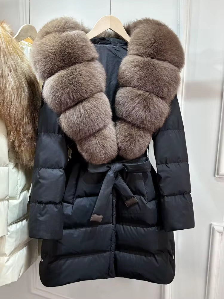 Real fox fur hooded coat filled with 90% white duck feathers. The fit is oversized - it has a draw string to tighten/loosen. This style has a hood.