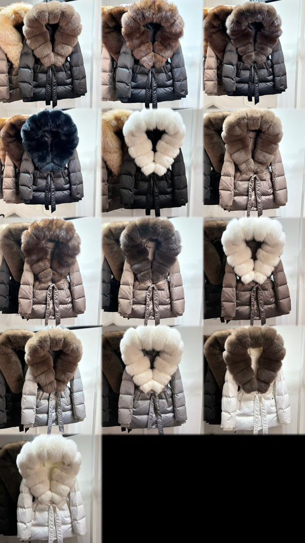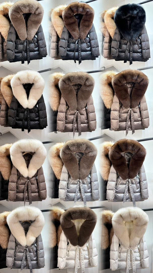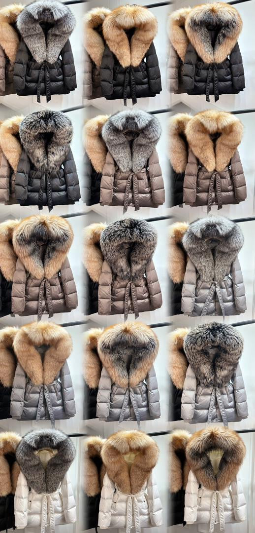 Real fox fur hooded coat filled with 90% white duck feathers. The fit is oversized - it has a draw string to tighten/loosen. This style has a hood.