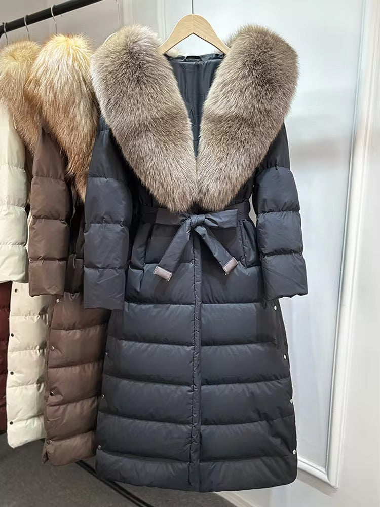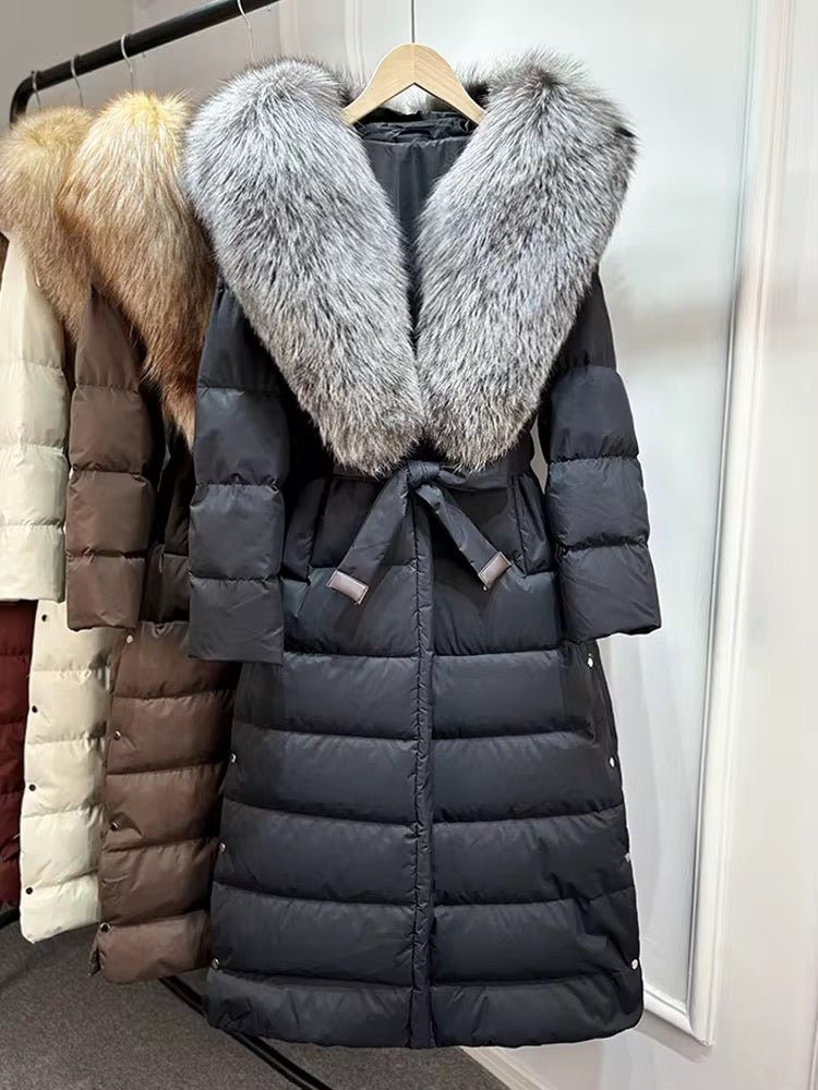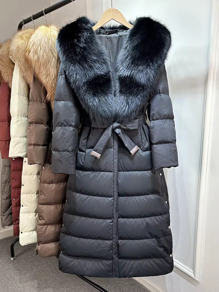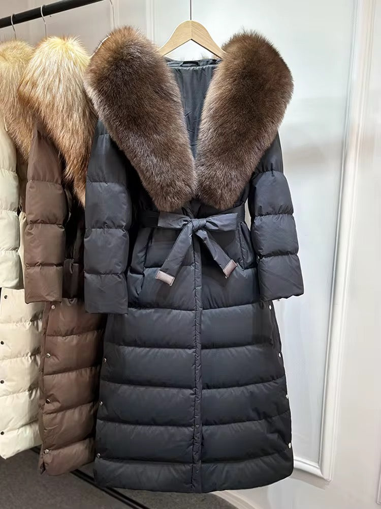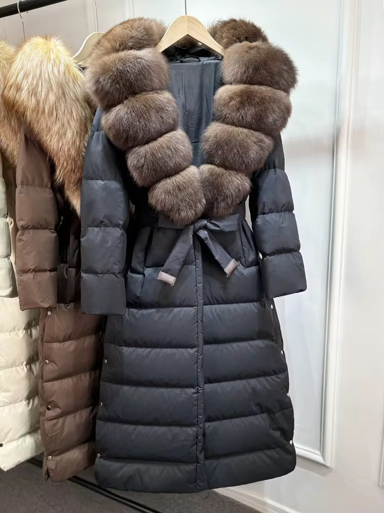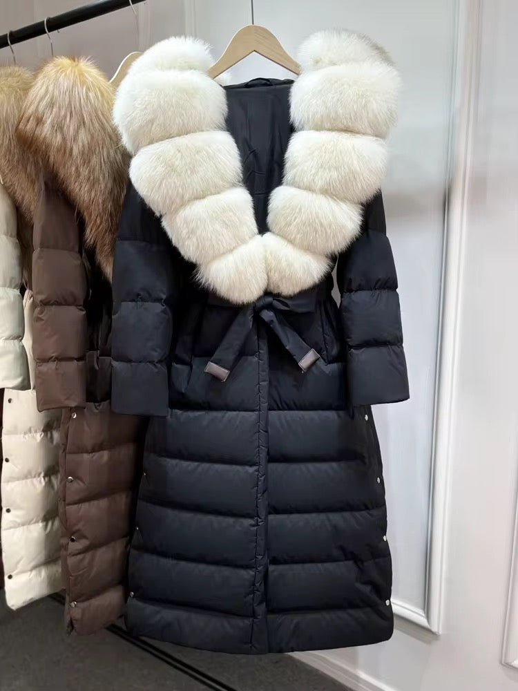 Real fox fur hooded coat filled with 90% white duck feathers. The fit is oversized - it has a draw string to tighten/loosen. This style has a hood.