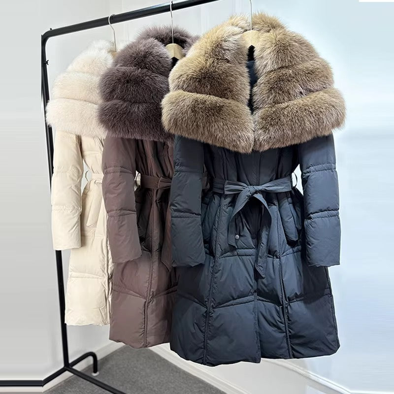 Real fox fur coat filled with 90% white duck feathers. The fit is oversized - it has a draw string to tighten/loosen.